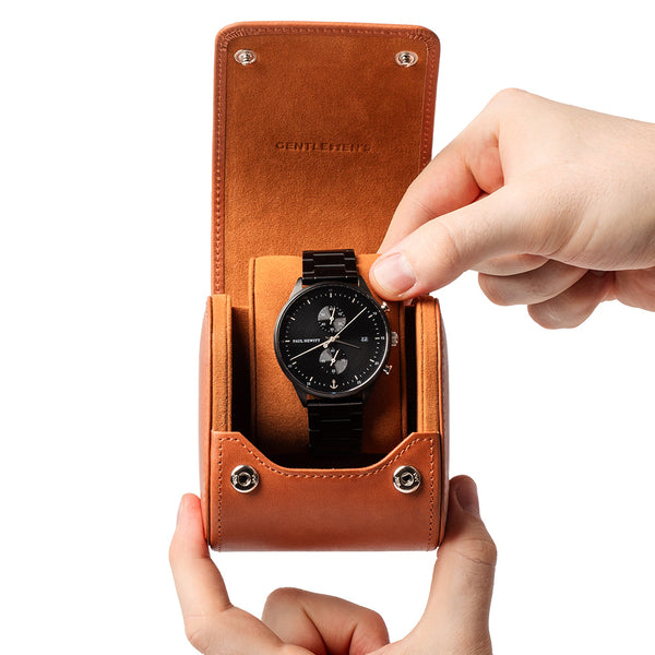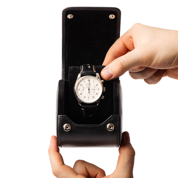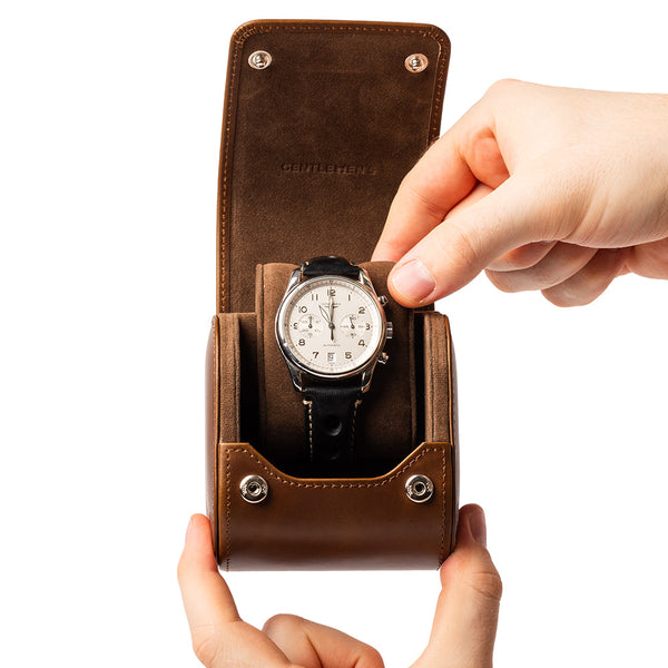 Die Gentlemen’s Uhrenbox aus echtem spanischen Leder überzeugt als und zugleich praktische Aufbewahrungslösung für hochwertige Zeitmesser. Ihr robustes Hard‑Case schützt zuverlässig vor äußeren Einflüssen, während das weiche Mikrofaserfutter Kratzer und Staub fernhält.
